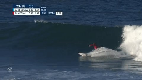 A melhor onda de Medina lhe rendeu a nota de 8,43, contribuindo bastante para que ele chegasse a 15,03 pontos na bateria, superando os 12,40 de Mineirinho, que teve um 6,83 como melhor nota.
