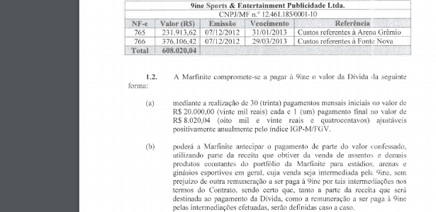 Outro documento, uma confissão de dívida, mostra que a Marfinite, em 2013, ainda devia à 9ine R$ 376 mil referentes a essa comissão pela intermediação da venda de assentos para a Fonte Nova. Esse outro acordo, assinado por 9ine e Marfinite e com firma reconhecida em cartório, ainda mostra que a agência de Ronaldo emitiu nota para o pagamento da comissão em 07/12/2012 – nesta data o ex-jogador ainda acumulava funções na 9ine e no COL.