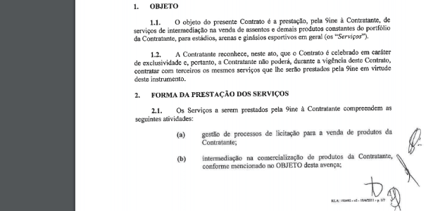 A reportagem teve acesso ao contrato entre Marfinite e 9ine; o documento, assinado em 2013 (segundo a própria empresa) mas com validade retroativa até 2011, tem como objeto expresso a “intermediação da venda de assentos e demais produtos do portfólio para arenas e ginásios esportivos em geral”. O acordo prevê exclusividade, além da comissão de 10% sobre os produtos vendidos. Ele teve validade e foi executado entre 2011 e 2013, com Ronaldo no COL.