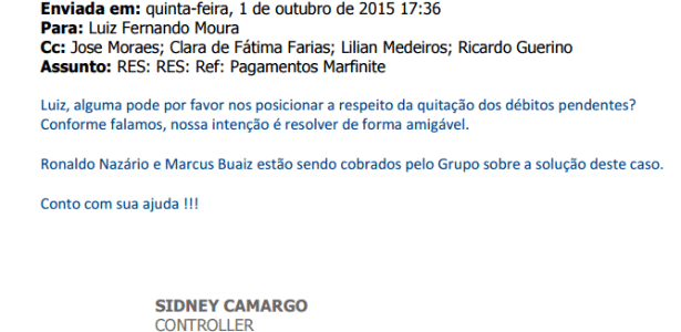 A reportagem obteve uma troca de e-mails recente entre 9ine e Marfinite. Em outubro de 2015, um gerente da agência cobra da empresa o pagamento de R$ 384 mil ainda devidos pela comissão, e diz que “Ronaldo Nazário e Marcos Buaiz (empresário e amigo do ex-jogador) estão sendo cobrados por uma solução para este caso”. Em resposta, um diretor da Marfinite diz que tentará viabilizar o pagamento.