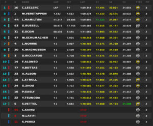 Na frente da pista, Verstappen largou bem, mas Leclerc ficou na cola do neerlandês. No entanto, na volta 12, o monegasco da Ferrari ultrapassou e tomou a primeira colocação.