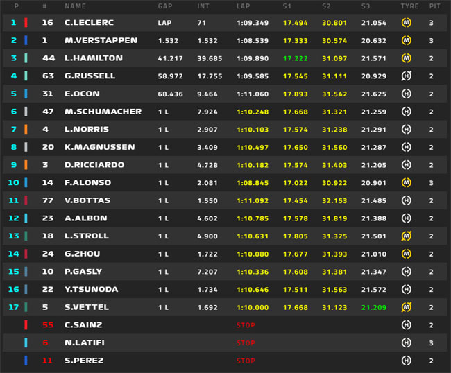 Logo na sequência, Verstappen foi para o pit para trocar os pneus e voltou em quinto. Contudo, ele logo ultrapassou Lance Stroll e fez bela disputa com Lewis Hamilton para voltar à briga pela liderança com a dupla da Ferrari, que agora contava com Carlos Sainz na vice-liderança.