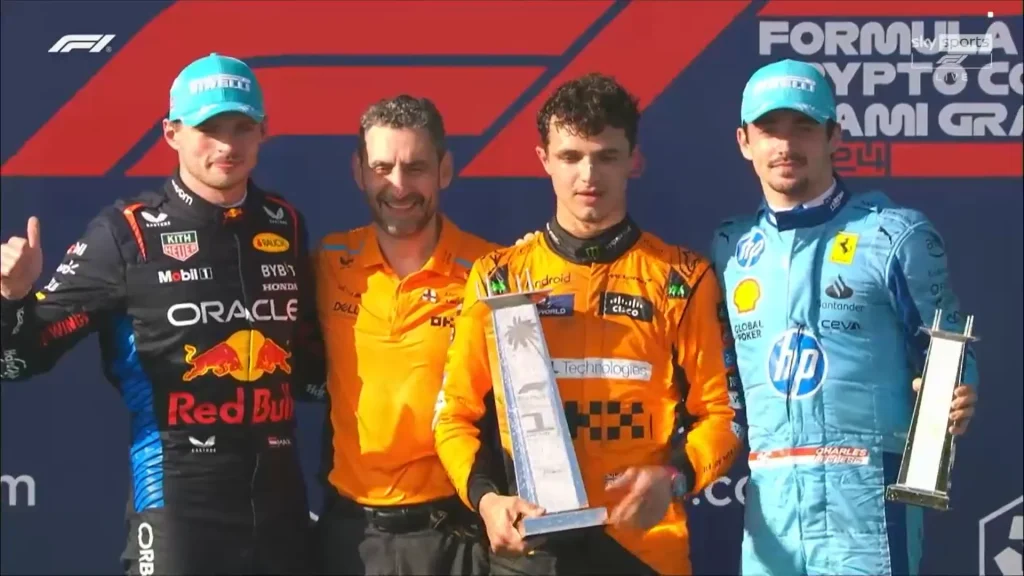 Norris, de 24 anos, até então, já tinha subido ao pódio em 15 oportunidades, mas nunca no lugar mais alto. Essa também foi a primeira vitória da McLaren na temporada. Antes, Verstappen venceu quatro (Bahrein, Arábia Saudita, Japão e China) e Carlos Sainz, da Ferrari, uma (Austrália).