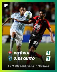 Voltando a disputar uma competição continental depois de nove anos, o Vitória teve uma estreou nesta quarta-feira na Copa Sul-Americana. No estádio Barradão, o time nordestino saiu atrás do placar, mas buscou o empate por 1 a 1 diante do Universidad de Quito-EQU, pela primeira rodada do Grupo B. O time equatoriano atuou metade do segundo tempo com um jogador a menos. Matheuzinho, de pênalti, marcou o gol do retorno às competições da Conmebol.