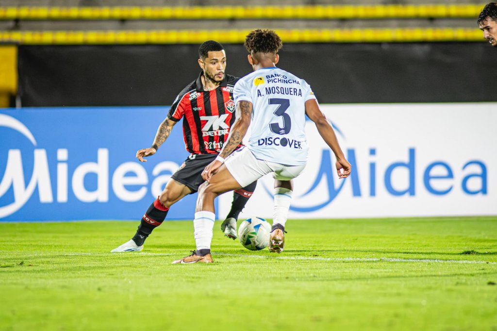 Logo aos 2 minutos, o centroavante Janderson recebeu lançamento de Lucas Arcanjo, ganhou a disputa com os zagueiros e finalizou de primeira, com a parte externa do pé direito. A bola subiu demais e foi por cima do gol. O time equatoriano respondeu na sequência. Farjado dominou rebote de Claudinho na entrada da área e chutou sem deixar a bola cair. Para o bem do Vitória, a bola foi passou por cima do gol de Arcanjo.