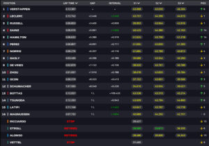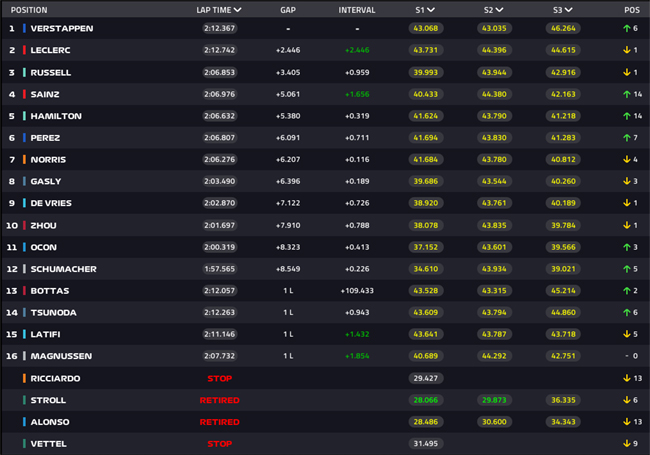 Sebastian Vettel, da Aston Martin, com problemas no motor, teve que deixar as pistas. Fernando Alonso, Stroll e Ricciardo também abandonaram. Hamilton, da Mercedes, que começou na penúltima colocação, conseguiu atingir a quinta posição.