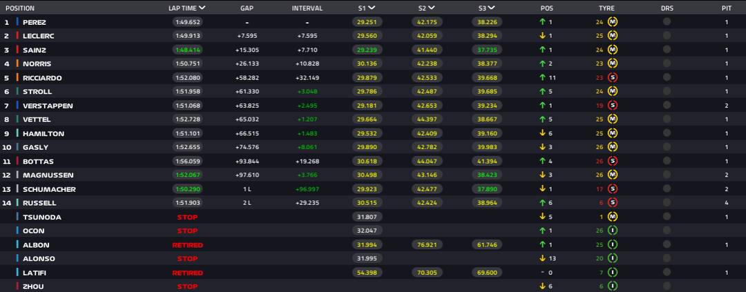Vale destacar que, na reta final, Pérez cometeu possível infração ao não manter a distância correta em outra intervenção do safety car. O caso será revisado pela FIA e pode resultar em punição para ao mexicano.